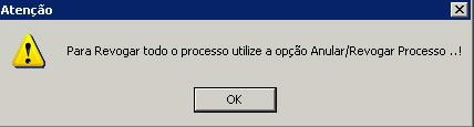 Esta mensagem será exibida quando o usuário for revogar todos os lotes/itens de um processo. Esta operação deve ser efetuada na revogação de todo o processo. Clique no botão “OK”. |