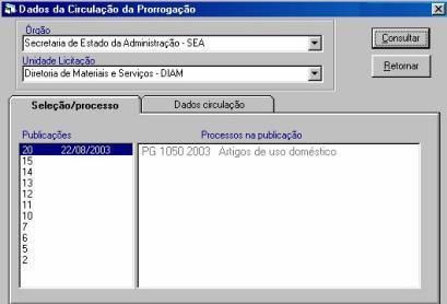 Na tela exibida, clique no botão “Consultar”. Na aba Seleção/Processo é exposta a relação de publicações. Selecione a publicação desejada.