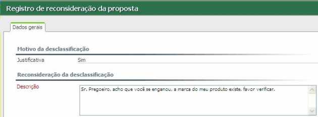 Nesta tela, o Fornecedor irá preencher o campo "Descrição", com suas considerações a respeito da desclassificação da proposta, e em seguida clicar no botão "Salvar". Se o Fornecedor fizer consideração a respeito de sua desclassificação, irá aparecer para o Pregoeiro, fazer a Reconsideração da Proposta, como mostra a tela a seguir: